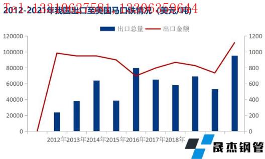 在之前的加征關稅從10%上調至25%的產品清單中就包含馬口鐵品種,2021年是近年來最大值9.5萬噸,占當年出口總量的7.04%。出口量前十位的國家分別為意大利、泰國、南非、墨西哥、美國、阿拉伯聯合酋長國、西班牙、菲律賓、馬來西亞、沙特阿拉伯,美國出口總量排第五位。但從下圖2012-2021年我國馬口鐵出口至美國馬口鐵總量情況看出,在加征關稅后對我國出口至美國的量并未發生明顯變化,雖然2020年出現了明顯下滑,主要因為當年全球疫情爆發美國多企停工停產訂單減少,而當時我國馬口鐵出口卻逆勢增長同時轉移至其他國家,2021年同比增長明顯。