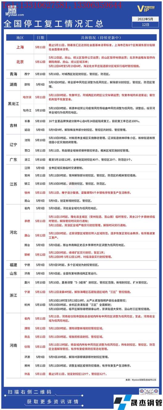 截至5月12日,據(jù)不完全統(tǒng)計,共有14個省份發(fā)布了停工復(fù)工最新信息。5月12日起,北京房山、順義區(qū)暫停地面交通運營。河南全域均為低風(fēng)險地區(qū)。唐山遷安有序推進(jìn)復(fù)工復(fù)產(chǎn)。具體情況如下: