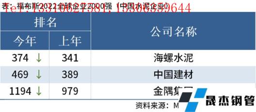 免責聲明:本網站(山東聊城晟杰無縫鋼管廠www.subnucleon.com)刊載的“中國3家水泥企業上榜福布斯2022全球企業2000強”等均源于網絡,版權歸原作者所有,且僅代表原作者觀點,本文所載信息僅供參考。轉載僅為學習與交流之目的,如無意中侵犯您的合法權益,請及時聯系刪除。本網站刊登此篇文章并不意味著本站贊同其觀點或證實其內容的真實性,我們不對其科學性、嚴肅性等作任何形式的保證。如果侵犯了您的版權,請盡快聯系我們予以撤銷,謝謝合作!