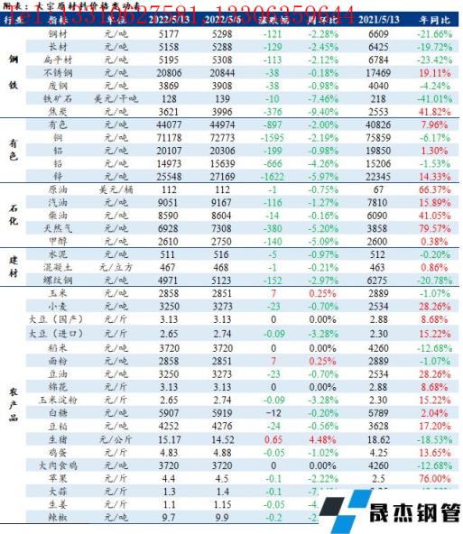 免責聲明:本網站(山東聊城晟杰無縫鋼管廠www.subnucleon.com)刊載的“周報:大宗工業原材料、能源及農產品價格周報(5.09-5.13)”等均源于網絡,版權歸原作者所有,且僅代表原作者觀點,本文所載信息僅供參考。轉載僅為學習與交流之目的,如無意中侵犯您的合法權益,請及時聯系刪除。本網站刊登此篇文章并不意味著本站贊同其觀點或證實其內容的真實性,我們不對其科學性、嚴肅性等作任何形式的保證。如果侵犯了您的版權,請盡快聯系我們予以撤銷,謝謝合作!