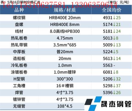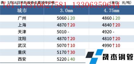 熱軋板卷:5月16日,全國24個主要城市4.75mm熱軋板卷均價5013元/噸,較上個交易日下跌8元/噸。受期貨盤面的影響午后價格小幅上揚,但成交普遍一般,看弱情緒仍在部分蔓延,商家多數仍謹慎操作,預計17日全國熱軋板卷價格將呈現小幅上漲的態勢。