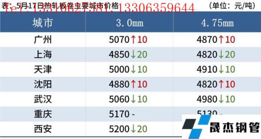 熱軋板卷:5月17日,全國24個主要城市4.75mm熱軋板卷均價5013元/噸,較上個交易日持平。現貨市場基本處于觀望狀態,不急于拿貨,市場整體成交情況較弱,盤面全日震蕩運行,午后部分市場有小幅下跌。供需角度來看,近期熱卷供應已經基本恢復正常,需求方面受盤面觸底反彈影響,部分投機商戶小批量備貨,但終端需求依然不佳,雖然前期部分延遲需求逐步釋放,但同比依然處于低位。綜合來看,預計近期全國熱軋板卷價格弱勢震蕩運行為主。