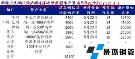 根據初步減限產方案,八鋼本部4座高爐全開,但不生產建筑厚壁無縫鋼管,預計影響建筑厚壁無縫鋼管產量5500噸/日,巴州和伊鋼基地各燜一座高爐,預計影響建筑厚壁無縫鋼管產量分別為3000噸/日和2000噸/日;昆玉燜一座高爐,預計影響建筑厚壁無縫鋼管產量1800噸/噸;昆侖和閩新無縫厚壁鋼管廠家建筑厚壁無縫鋼管停產十天,預計分別影響建筑厚壁無縫鋼管產量2800噸/日和3000噸/日;大安鋼鐵資源暫不投往新疆區域;金特待定。