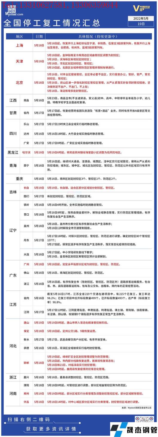 截至5月19日,據不完全統計,共有16個省份發布了停工復工最新信息。北京多地強化封控區管控區管理。天津多地調整為封控區。上海再恢復開行8趟列車。唐山轉入常態化精準管控新階段。具體情況如下: