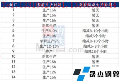 據(jù)不完全統(tǒng)計(jì),截至5月20日,國內(nèi)13家無縫厚壁鋼管廠家發(fā)布檢修計(jì)劃。其中,中天鋼鐵因一座轉(zhuǎn)爐檢修,坯料不足,兩條棒材線停產(chǎn)檢修,預(yù)計(jì)5月份影響棒材產(chǎn)量4.5萬噸。
