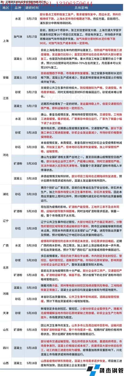 截至5月20日,據(jù)百年建筑網(wǎng)調(diào)研,13個省份建材市場受到了不同程度的影響。隨著華東、華南疫情和暴雨情況的緩解,物流運輸逐步恢復(fù)正常,材料進場速度加快,下游工地施工節(jié)奏提升。在疫情有效管控下,基建、房建方面的需求陸續(xù)回升,但由于疫情反復(fù)抬頭的影響,仍有上行空間有限。具體情況如下: