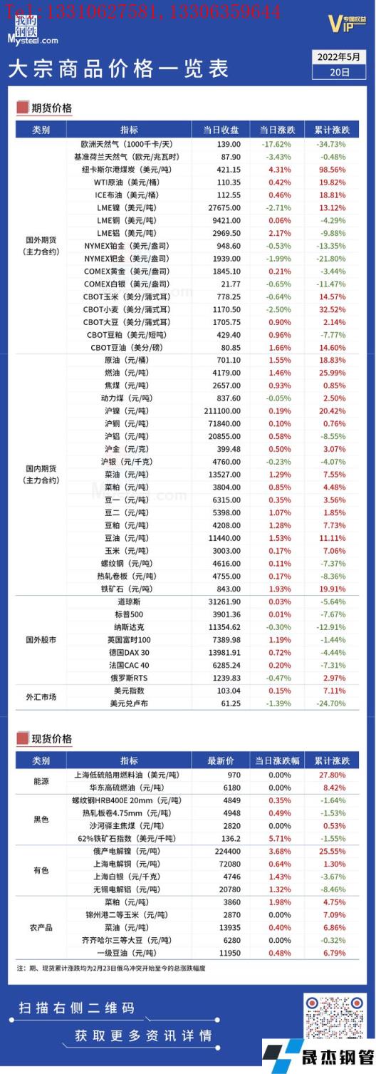 免責聲明:本網站(山東聊城晟杰無縫鋼管廠www.subnucleon.com)刊載的“俄烏局勢丨大宗商品價格一覽表(5月20日)”等均源于網絡,版權歸原作者所有,且僅代表原作者觀點,本文所載信息僅供參考。轉載僅為學習與交流之目的,如無意中侵犯您的合法權益,請及時聯系刪除。本網站刊登此篇文章并不意味著本站贊同其觀點或證實其內容的真實性,我們不對其科學性、嚴肅性等作任何形式的保證。如果侵犯了您的版權,請盡快聯系我們予以撤銷,謝謝合作!