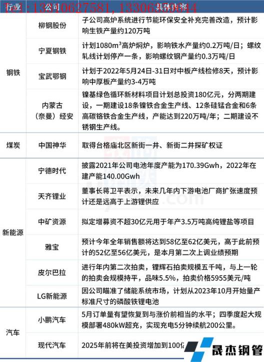 5月24日,匯總部分大宗商品相關企業(yè)動態(tài)。寧夏鋼鐵、寶武鄂鋼宣布檢修計劃,柳鋼股份計劃進行高爐改造;天齊鋰業(yè)董事長蔣衛(wèi)平表示,鋰電行業(yè)景氣度高,未來幾年內下游電池廠商擴張速度預計還是遠高于上游鋰供應。具體情況如下: