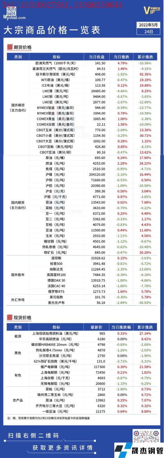 免責聲明:本網站(山東聊城晟杰無縫鋼管廠www.subnucleon.com)刊載的“俄烏局勢丨大宗商品價格一覽表(5月24日)”等均源于網絡,版權歸原作者所有,且僅代表原作者觀點,本文所載信息僅供參考。轉載僅為學習與交流之目的,如無意中侵犯您的合法權益,請及時聯系刪除。本網站刊登此篇文章并不意味著本站贊同其觀點或證實其內容的真實性,我們不對其科學性、嚴肅性等作任何形式的保證。如果侵犯了您的版權,請盡快聯系我們予以撤銷,謝謝合作!