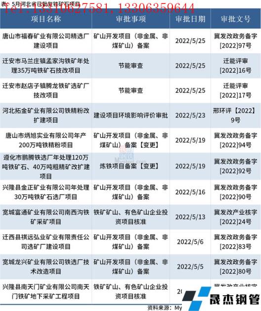 據不完全統計,2022年5月河北省共批復鐵礦石相關項目11個。其中,有5個礦山開發項目備案(變更),2個鐵礦石技改項目節能審查,2個鐵礦礦山投資項目核準,1個鐵精粉擴建項目環境影響評價審批和1個煉鐵項目備案(變更)。