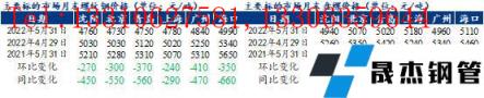 截至5月31日,東北地區(qū)建筑厚壁無縫鋼管主要流向市場中螺紋鋼價(jià)格海口4990元/噸最高、環(huán)比上月末跌350元/噸,北京4730元/噸最低、環(huán)比上月末跌300元/噸;盤螺海口5110元/噸最高、環(huán)比上月末跌350元/噸,沈陽4940元/噸最低、環(huán)比上月末跌320元/噸。