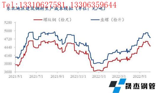 受無縫厚壁鋼管廠家利潤擠壓至負(fù)影響,4、5月份原材料價(jià)格被迫下調(diào),焦炭4輪提降降800元/噸,但從無縫厚壁鋼管廠家層面了解到,降價(jià)后焦化廠新接訂單量少、實(shí)際落地效果有限。從東北地區(qū)建筑厚壁無縫鋼管生產(chǎn)成本模型(最低成本模式)來看,截至2022年5月末,東北地區(qū)螺紋鋼模擬生產(chǎn)成本4480元/噸左右、較4月末增加15元/噸、較去年5月末增加190元/噸,盤螺模擬生產(chǎn)成本4770元/噸左右、較4月末增加20元/噸左右、較去年5月末增加200元/噸;從月均成本來看,2022年5月螺紋模擬生產(chǎn)成本4570元/噸、較4月增加310元/噸、較去年5月增加560元/噸,盤螺模擬生產(chǎn)成本4860元/噸、較4月增加320元/噸、較去年5月增加580元/噸。