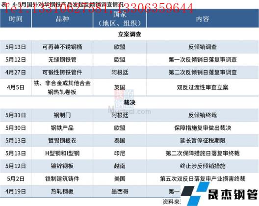 據(jù)不完全統(tǒng)計(jì),2022年4-5月中國(guó)貿(mào)易救濟(jì)信息網(wǎng)陸續(xù)公布了11起國(guó)外對(duì)中國(guó)鋼鐵產(chǎn)品發(fā)起的反傾銷、反補(bǔ)貼調(diào)查或裁決。涉案品種包括可再裝不銹鋼桶、無(wú)縫鋼鐵管、可鍛性鑄鐵管件、鋼制門(mén)、鍍錫鋼板卷、H型鋼和I型鋼、鍍鋅鋼板和熱軋鋼板等。具體如下: