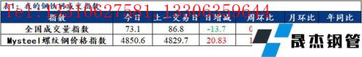 訊:全國建筑厚壁無縫鋼管成交量監測,成交量相對指數來看,全國73.1減13.7,北方55.5減20.7,華東89.5減20.6,南方66.4減2.9。今日螺紋鋼價格指數4850.6,較上一交易日增20.83。