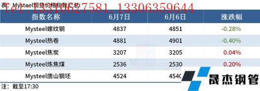 ◎ 據不完全統計,截至6月7日,國內6家無縫厚壁鋼管廠家發布檢修計劃。其中,撫順新鋼鐵計劃6月中旬起對廠內1座580m3高爐進行30天左右的年修,預計鐵水日產量減少0.15萬噸左右、共影響鐵水產量4.5萬噸左右。詳情>>