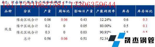 1、調研數據顯示,統計的河南地區10家建筑厚壁無縫鋼管樣本無縫厚壁鋼管廠家中,河南省無縫厚壁鋼管廠家線盤日均產量0.56萬噸,較上周產量增加0.06萬噸;線盤產能利用率52.34%,較上周增幅12%。