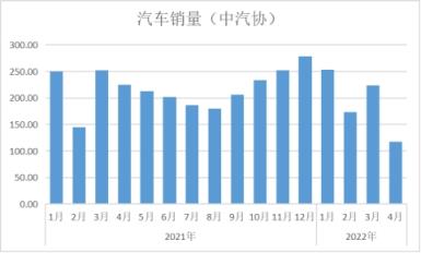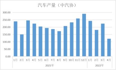 根據(jù)中國汽車工業(yè)協(xié)會統(tǒng)計數(shù)據(jù)顯示,2022年4月份,汽車產(chǎn)銷分別完成120.5萬輛和118.1萬輛,環(huán)比分別下降46.2%和47.1%,同比分別下降46.1%和47.6%。1-4月,汽車產(chǎn)銷分別完成769.0萬輛和769.1萬輛,同比分別下降10.5%和12.1%。