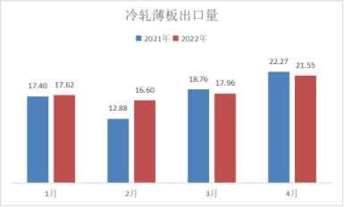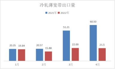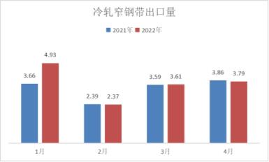 冷軋品種出口方面,4月份出口量同比下降,尤其以冷軋薄寬帶下降幅度最大,具體數(shù)據(jù)來看,冷軋薄板出口量為21.55萬噸,同比下降3.23%;冷軋薄寬帶出口量為21.5萬噸,同比下降64.46%,冷軋窄鋼帶出口量為3.79萬噸,同比下降1.81%。