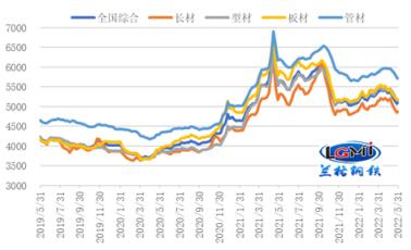 5月份,穩增長信號和政策雖明顯加強,但受疫情影響下游需求釋放緩慢,市場預期和信心明顯不足,國內無縫鋼管市場價格持續震蕩下行。據云商平臺監測數據顯示,截至5月31日,全國無縫鋼管 厚壁鋼管綜合價格為5098元,較上月末下跌258元,跌幅為4.8%,年同比下跌10.6%。其中,長材價格為4875元,較上月末下跌288元,跌幅5.6%,年同比下跌8.9%;板材價格為5190元,較上月末下跌235元,跌幅為4.3%,年同比下跌12.8%;型材價格指數為5166元,較上月末下跌241元,跌幅為4.5%,年同比下跌9.6%;管材價格為5716元,較上月末下跌241元,跌幅為4.1%,年同比下跌8.2%(詳見圖1)。
