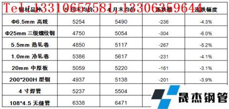 分品種來看,云商平臺監測的8大無縫鋼管 厚壁鋼管品種10大城市均價顯示,5月31日,各品種價格相比上月底均明顯下跌,其中,三級螺紋鋼跌幅最大,為6.0%;無縫管跌幅最小,為2.1%;其他品種跌幅在3.1-5.2%之間(詳見表1)。