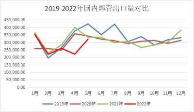 據海關最新統計顯示,2022年5月我國出口焊管32.06萬噸,比上月增長45.17%;進口焊管1.05萬噸,比上月下降18.06%;凈出口焊管31.00萬噸,較上月增長32.91%。1-5月凈出口量131.23萬噸,較上年下降13.06%,處于三年均值以下水平,在國內焊管產量的占比回升至5.75%。