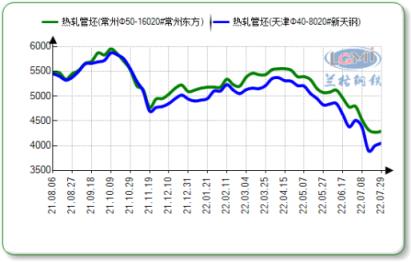 7月末,北方地區(qū)無縫鋼管廠家20#熱軋管坯出廠報價4050-4240元,20#連鑄出廠報價3940-4150元;南方地區(qū)20#熱軋出廠報價4240-4570元,北方新天鋼、南方東方兩家無縫鋼管廠家熱軋管坯價差維持在190元左右,較7月中旬相比兩者價差有所收窄。受美聯(lián)儲加息預(yù)期及國內(nèi)需求持續(xù)低迷影響,管坯價格大幅下跌,北方地區(qū)熱軋管坯價格跌至3970元,創(chuàng)近一年以來的新低,不過在7月27日筑底后管坯價格呈現(xiàn)小幅上揚走勢。