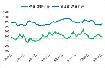 8月焊鍍管與原料價差收縮173元(詳見圖2)。焊管生產利潤一度虧損百元左右,繼續出現停購原料2-3天的情況;鍍鋅管生產利潤相對抗跌,整體處于虧損邊緣。結算周期內焊管生產利潤核算平均盈利12元,鍍鋅管生產利潤核算平均盈利57元。