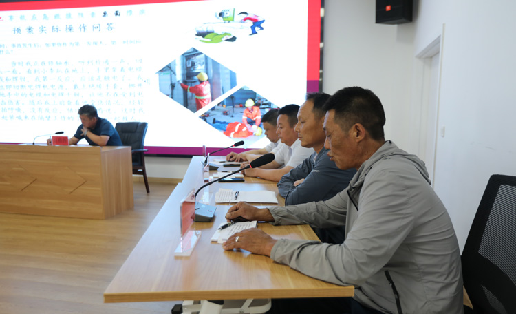 演練上,主持人向參加活動人員介紹了演練預設場景:“2023年6月某日下午3點,悅升公司機修班組工作現(xiàn)場全體工作人員正緊張有序地進行維修工作,設備維修人員李某正在檢維修區(qū)域使用電焊機對一車輛進行焊接作業(yè),檢維修人員陳某在一旁修軸承。這時,由于焊鉗處電源線破損嚴重發(fā)生漏電,導致李某突然觸電倒地,陳某見狀大驚,反應過來后立馬拔掉電焊機電源插頭,帶上絕緣手套將帶電電線移開,隨后立刻向周邊大聲呼救。”隨后,由演練主持人根據(jù)情景事件提出問題,分別請現(xiàn)場第一發(fā)現(xiàn)人、現(xiàn)場負責人、總指揮、應急辦公室主任、警戒疏散組組長等參演人員進行回答。演練組織有序,現(xiàn)場氛圍和諧,參演人員回答問題邏輯清晰,達到了熟練掌握應對觸電事故流程、事故處理基本原則、各級崗位職責的目的。