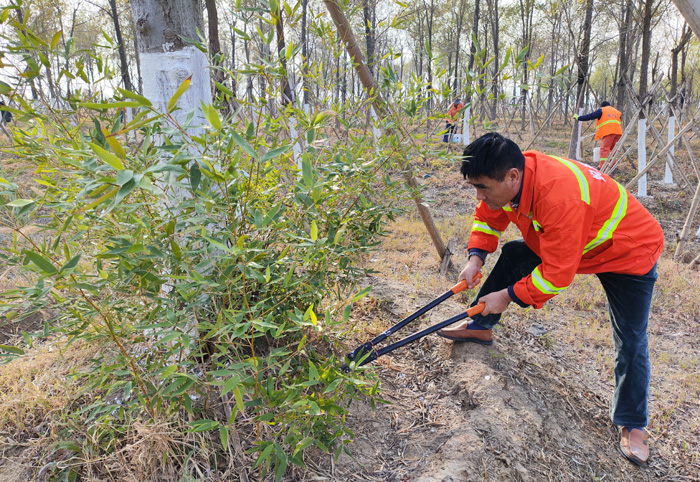 當前,為扎實做好冬季樹木養護工作,提高樹木的過冬、抗病和抗蟲能力,李傳武帶領班組全員開展樹木涂白行動,悉心為樹木披上“防寒衣”。為達到同一標準,他采用“立桿涂白法”,首先安排專人進行劃線,將行道樹涂白高度統一控制在1.2米,使區域內涂白高度保持一致,確保樹木涂白效果與植物整體美觀,經過10天的持續工作,完成10000余棵行道樹涂白工作(完成工作量約20%)。